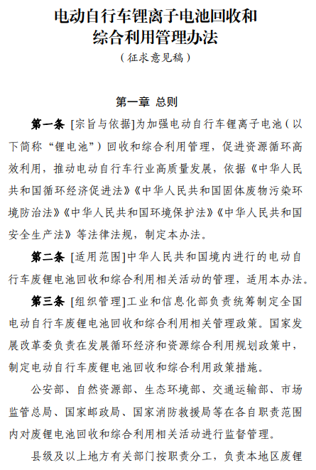 【大河财立方消息】12月18日,工信部正式发布《电动自行车锂离子电池回收和综合利用管理办法(征求意见稿)》,旨在强化电动自行车锂离子电池的回收与综合利用体系,促进资源的高效循环,为电动自行车行业的绿色转型与高质量发展提供坚实支撑。