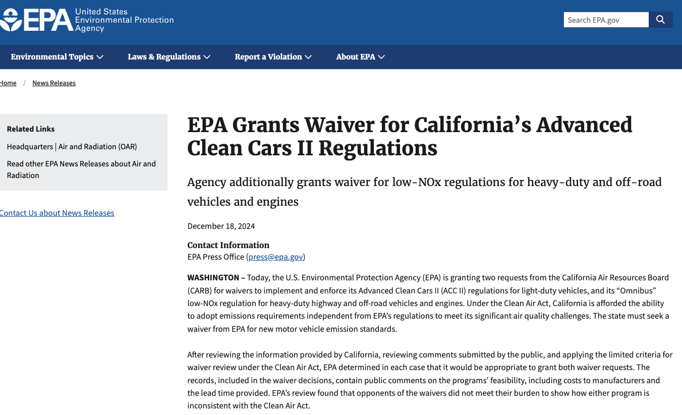 虽然理论上特朗普上任后可以让环保署撤销这一豁免,但完成相关程序可能需要数月时间,更何况加州肯定会启动漫长的诉讼程序。一些共和党议员鼓励使用《国会审查法》的特别权力来撤销这一豁免,但美国政府问责办公室之前已裁定撤销环保豁免超出了审查法的管理范围,尽管如此,一些共和党人仍在鼓励立法机构在明年挑战这一行政解释。
