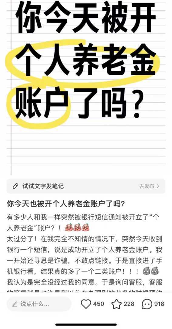记者调查了解到,部分消费者在没有操作的情况下突然收到短信通知,告知其已开设个人养老金账户。这可能是由于他们在银行办理业务时预约了个人养老金账户开户,或个人养老金制度从试点到全面铺开后,银行系统为其正式开通。此外,部分消费者在互联网平台办理相关业务时,点击了微信立减金领取活动,从而默认协议预约了个人养老金账户开户。