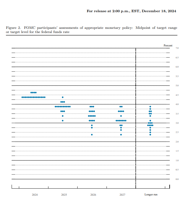 美联储在降息的同时,通过备受关注的“点阵图”表示,2025年预计只会降息两次,低于此前预测的四次。根据最新的季度预测,多位官员预计明年的降息次数将少于几个月前的预期,基准利率到2025年底预计将降至3.75%~4%的区间。