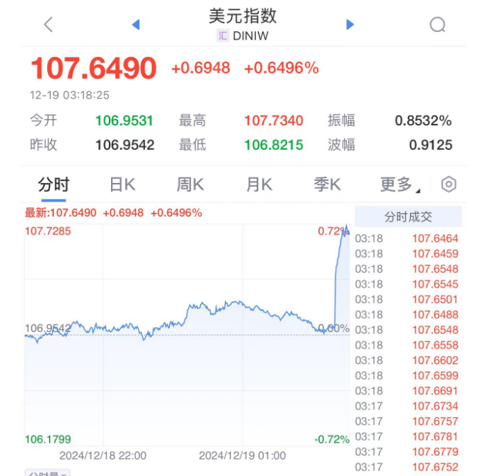 美联储宣布降息25个基点至4.25%~4.50%区间,为连续第三次降息,符合预期。决议公布后,美股市场剧烈波动,三大指数直线下跌,美元指数直线拉升。