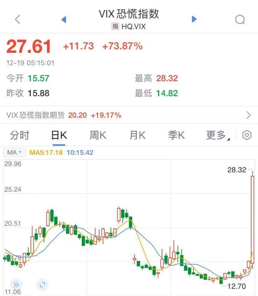市场恐慌情绪急剧升温,恐慌指数VIX日内涨幅一度高达78%,美股收盘后暂时报28.32。