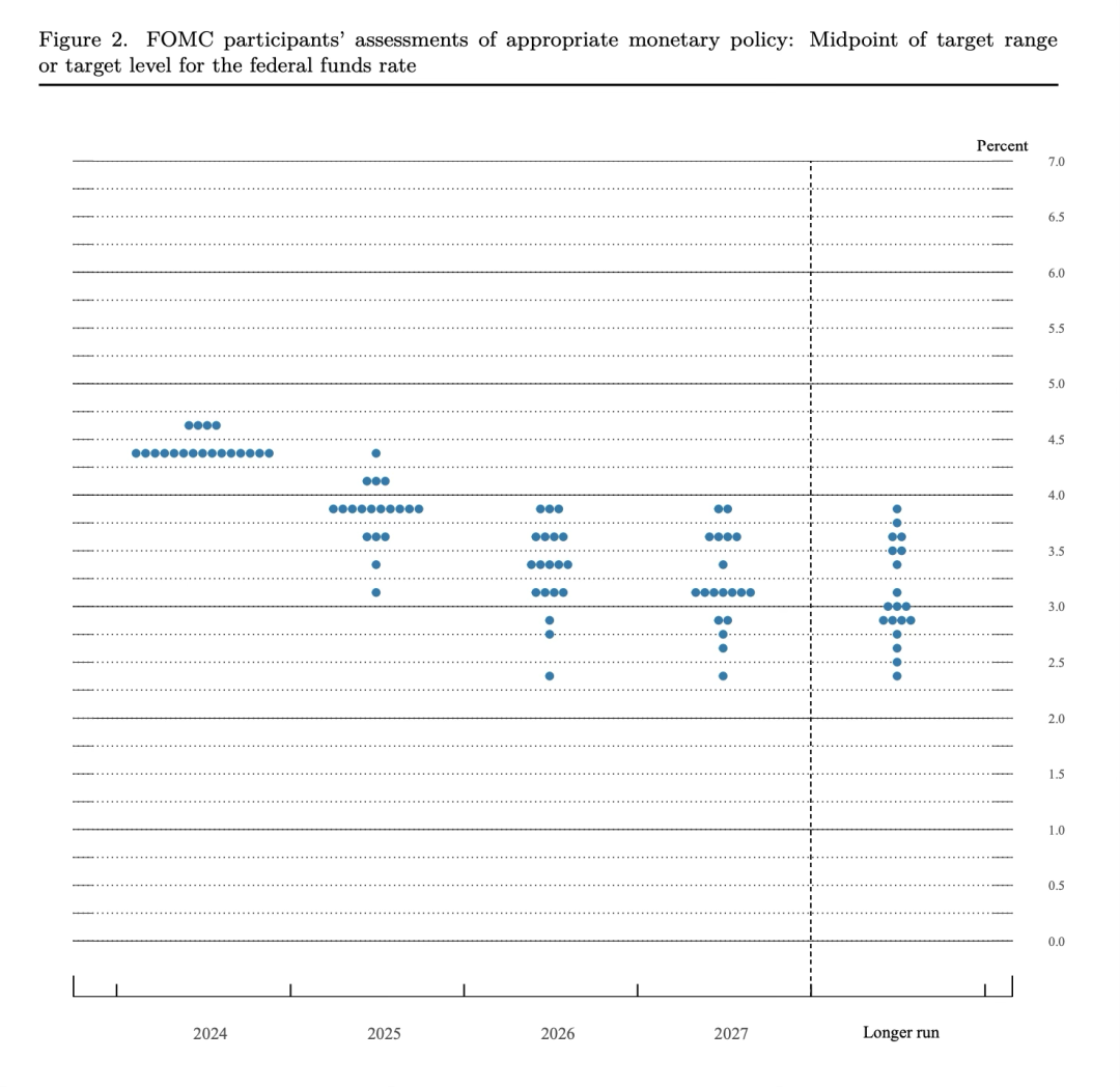 最新点阵图也显示,美联储官员对明年降息次数的预期有所削减。在19位官员中,有10位官员认为2025年应累计降息50个基点,即降息两次,而此前的9月预测为降息四次。此外,美联储FOMC最新经济预测显示,2025年、2026年和长期的联邦基金利率预期中值分别为3.9%、3.4%和3.0%,较9月时的预测有所上调。