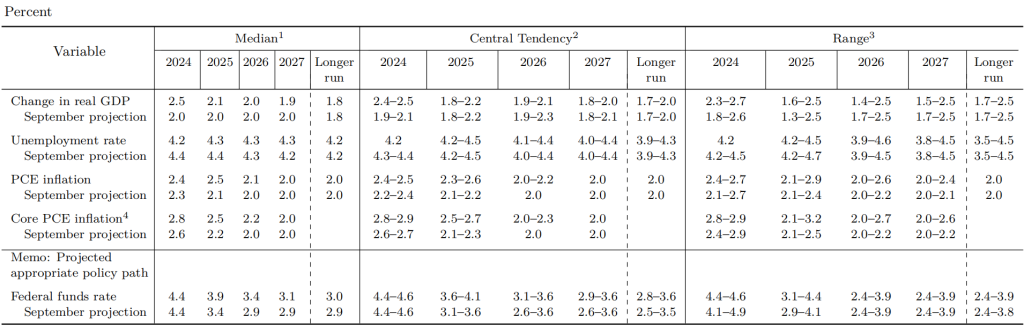 此外,美联储还发布了最新的经济预测,预计今年美国经济增速将上调至2.5%,2025年和2026年的增速则分别为2.1%和2.0%。同时,失业率预测今年为4.2%,较9月有所下降;PCE通胀和核心PCE通胀预测也有所上调,但均保持在可控范围内。