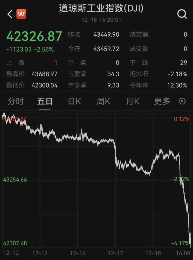 美联储降息25个基点,美股大幅下跌,纳指跌超700点,道指录得1974年以来最长连跌纪录。金价跌至一个月最低,美元指数和美债收益率飙涨。特斯拉跌超8%,市值一夜蒸发千亿。