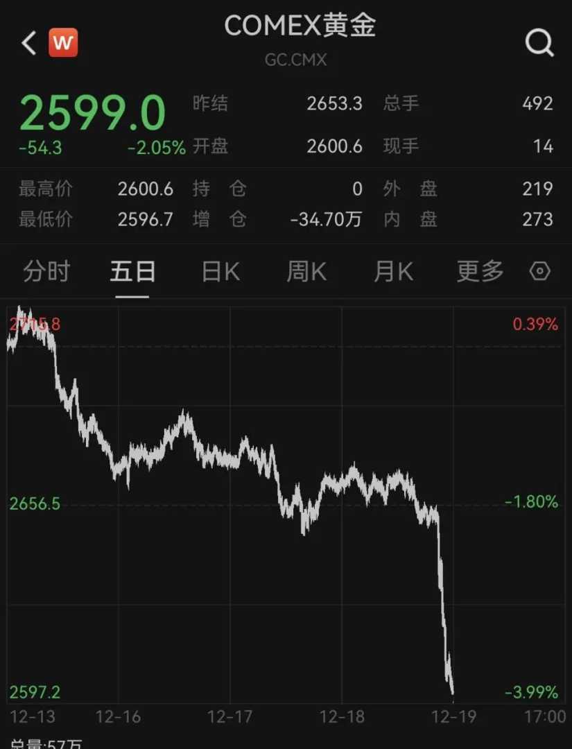 与此同时,黄金市场也遭受重创。在美联储利率决定公布后,金价打破日内震荡状态,加速下跌。现货黄金跌幅达到2.32%,报2585.70美元/盎司,为11月18日以来首次跌破2600美元/盎司整数关口。现货白银和铜期货也纷纷走低。