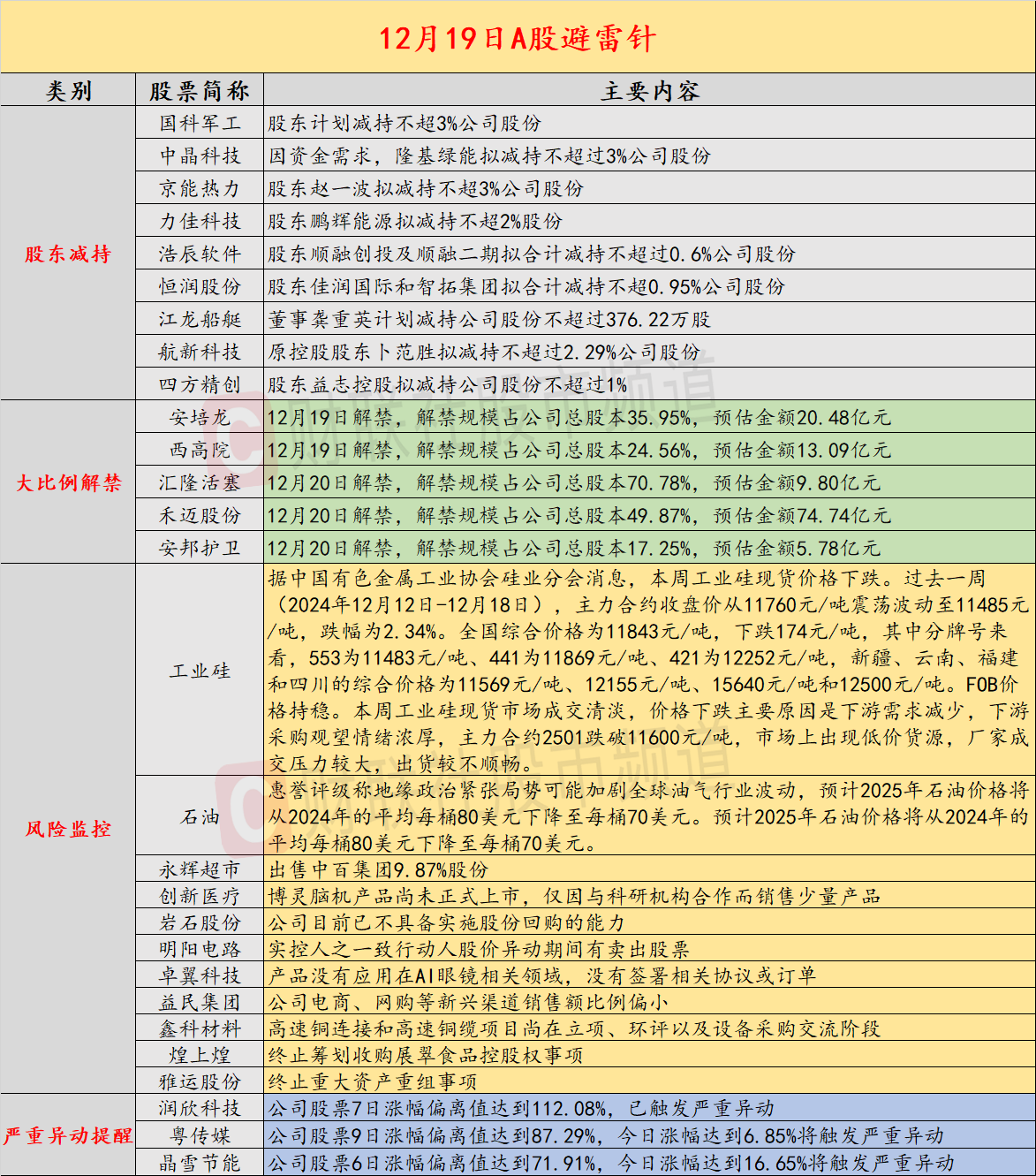 导读:财联社12月19日发布投资避雷针,近期A股及海外市场潜在风险概览。国内经济方面,工业硅现货市场成交清淡价格下跌;工信部征求意见,电动自行车企业需承担废锂电池回收责任。公司预警方面,永辉超市出售中百集团股份,创新医疗风险提示,多家公司股东计划减持。海外市场,美股三大指数大幅下跌,道指创最长连跌记录;美联储官员预期2025年降息幅度有限。此外,黄金、白银期货及离岸人民币汇率均走低。