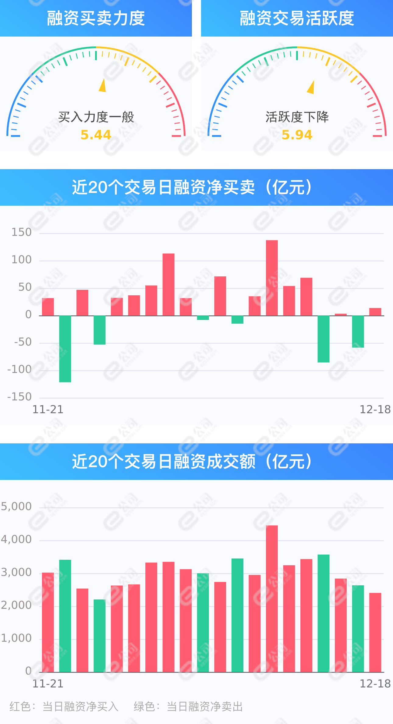 截至12月18日,沪深交易所融资余额双增,上交所增加3.64亿元,深交所增加9.83亿元,两市合计增加13.46亿元,但交易活跃度下降8.84%。