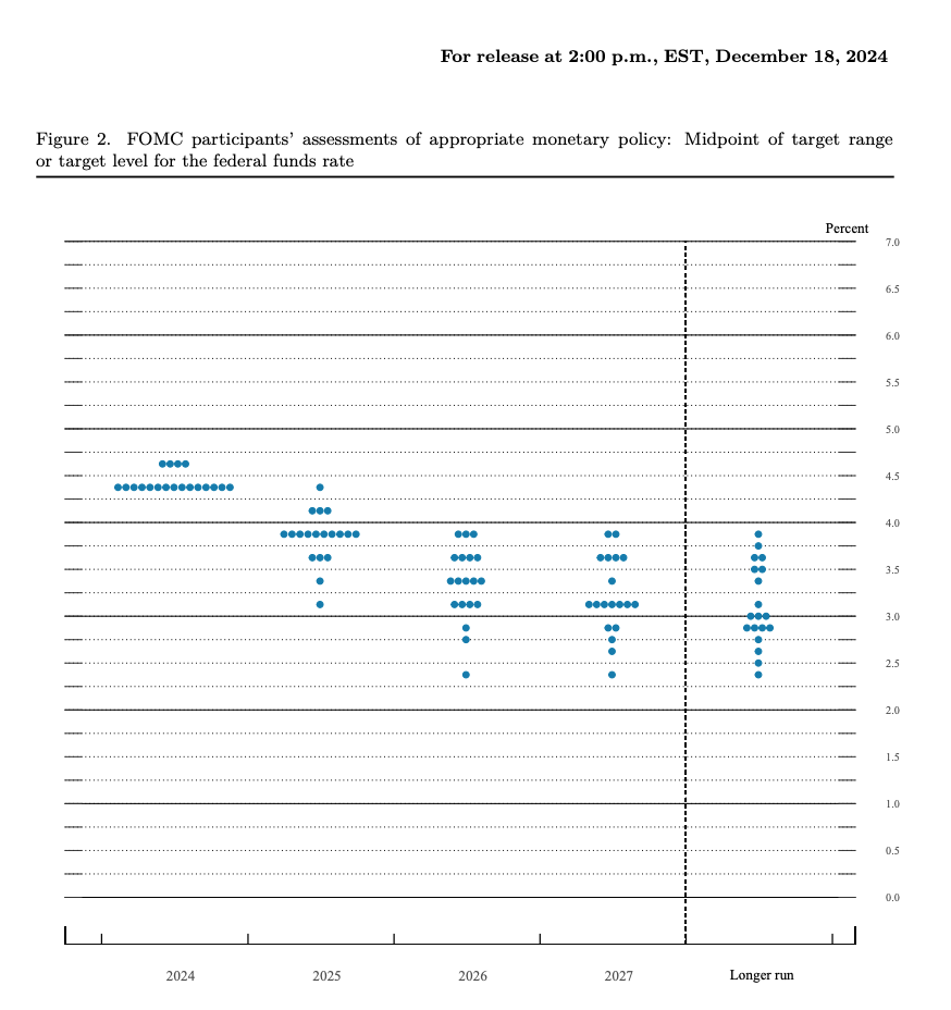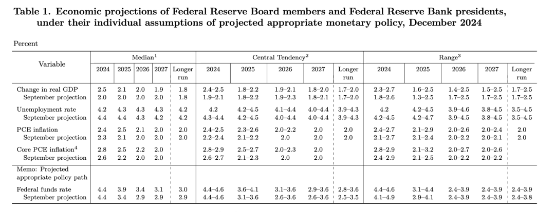这是美联储自9月和11月以来的连续第三次降息,今年累计降息幅度达到100个基点。值得注意的是,美联储上调了未来两年的通胀预期和利率预期水平,点阵图暗示明年或将降息两次,较9月时的四次预期有所减少,显示出美联储的“鹰派”立场。