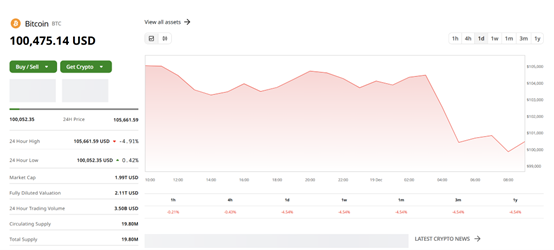 这一预测意味着,比特币的价格有望在当前约100475美元的基础上飙升近400%。近期,比特币市场经历了波动,尤其是在美联储主席鲍威尔周三宣布联储不打算持有数字货币,并对明年降息持谨慎态度后,比特币价格在24小时内下跌了近5%。尽管如此,本周早些时候,比特币曾一度创下108000美元的历史新高。