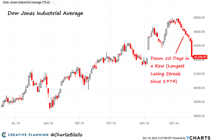 尽管华尔街普遍预期本周美联储将采取“鹰派降息”措施,但美联储的鹰派立场远超预期,给美国市场带来了巨大冲击。随着道指重挫1100点,创下自1974年以来首个“十连阴”,美股、美债、黄金、比特币等资产纷纷暴跌,市场陷入“无差别”抛售,投资者对美联储决议结果感到极度恐慌。