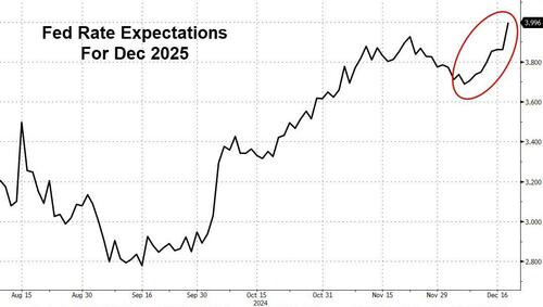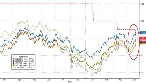 债市方面,美债收益率大涨,30年期和10年期美债收益率均超过美联储联邦基金利率目标上限4.5%,2年期和5年期美债收益率也在升向这一关口。债市似乎已不相信美联储还能再降多少息,利率市场对美联储2025年底的利率预期已接近4%。