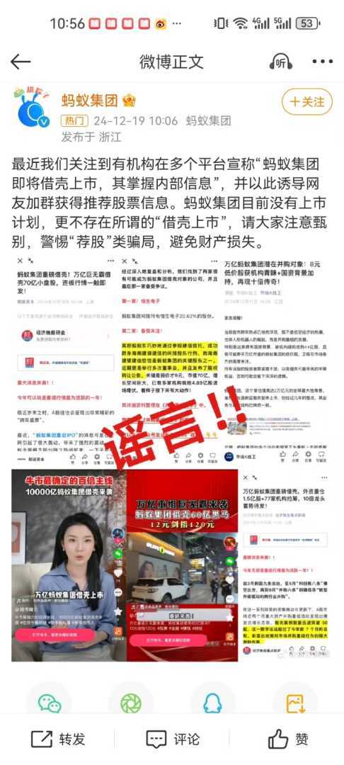 12月19日,蚂蚁集团在官方微博发布声明,正式回应了近期市场流传的关于其即将借壳上市的传言。声明指出,近期有机构在多个平台散布‘蚂蚁集团即将借壳上市,掌握内部信息’的虚假消息,并借此诱导网友加入群聊以获取所谓的推荐股票信息。
