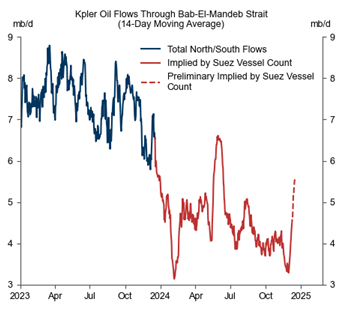 但有迹象表明,随着胡塞武装降低攻击频率,近来红海的油轮运输似乎正在恢复。高盛援引全球贸易情报公司Kpler的最新数据显示,过去几周红海油轮运输的过境量大幅增加。