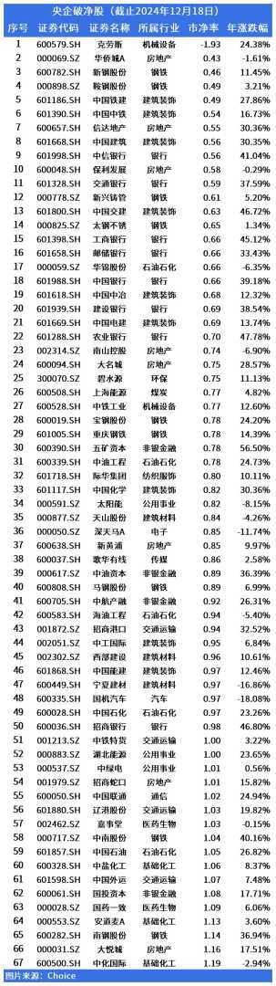 Choice数据显示,截至2024年12月18日收盘,A股市场中共有67家央企公司破净,年内平均涨幅达到16.54%。其中,五矿资本表现最为突出,涨幅高达56.50%,而国机汽车则跌幅最大,达到18.08%。年内,仅有12家公司录得负收益。
