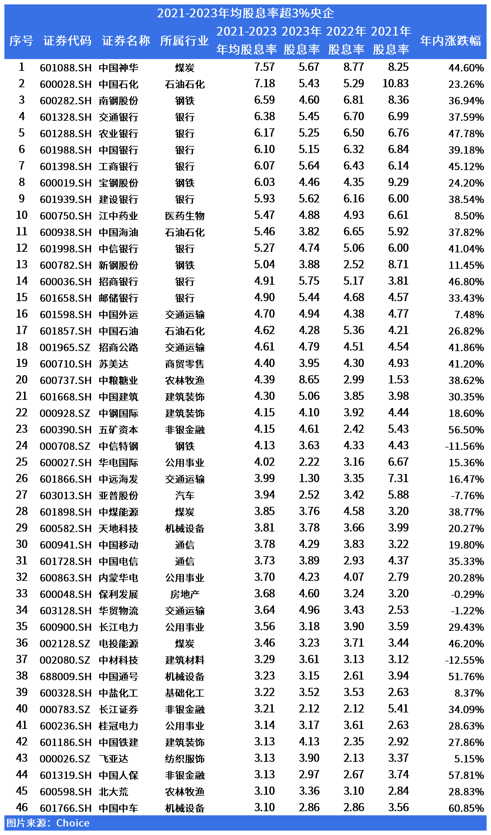据统计,截至2024年12月18日,2021-2023年均股息率超过3%的央企有46家。其中,中国神华的年均股息率高达7.57%,位居榜首;中国石化则以7.18%的股息率紧随其后。从涨跌幅方面来看,中国中车表现最为亮眼,涨幅高达60.85%;而中材科技则跌幅超过12%。总体来看,上涨个股达41只,仅5只个股下跌,年内平均涨幅达28.03%。从行业分布来看,银行业表现突出,共有8家企业上榜,且有5家进入前十名。钢铁、公用事业行业紧随其后,均有4家进入榜单。
