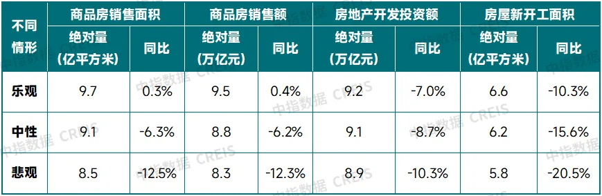 在满足上述假设条件且未发生超预期事件的前提下,中指研究院测算得出,2025年全国房地产市场将呈现“销售规模恢复面临挑战,新开工面积、开发投资或继续回落”的特点。预计中性情形下,全国商品房销售面积同比下降6.3%;乐观情形下,若城中村改造及收储存量房等政策加快落实,居民置业意愿提升,销售面积或可实现止跌;悲观情形下,政策落实节奏较慢,居民置业意愿继续下降,销售面积同比预计下降12.5%。