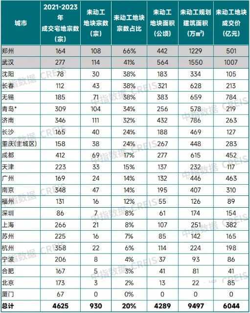 根据各城市规自委公布的存量住宅用地及中指监测数据估算,截至2024年三季度,22城2021-2023年招拍挂成交涉宅用地中未动工地块共约930宗,规划建筑面积9497万平方米,成交价6044亿元,未动工宗数占比20%。其中,郑州、武汉未动工面积超过1000万平米。促进投资开工“止跌回稳”的关键在于盘活闲置存量土地,增加市场有效供应,推动市场进入新循环。