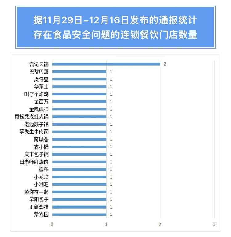 据统计,自11月29日至12月16日,袁记云饺有2家门店存在食品安全问题,巴黎贝甜、华莱士、南城香、喜茶、鱼你在一起、田老师红烧肉等品牌各有1家门店上榜。而从今年1月至今的统计数据来看,茉酸奶以20家门店存在问题位居榜首,蜜雪冰城、张亮麻辣烫、田老师红烧肉、南城香、小谷姐姐等品牌存在问题门店数量均超过10家。