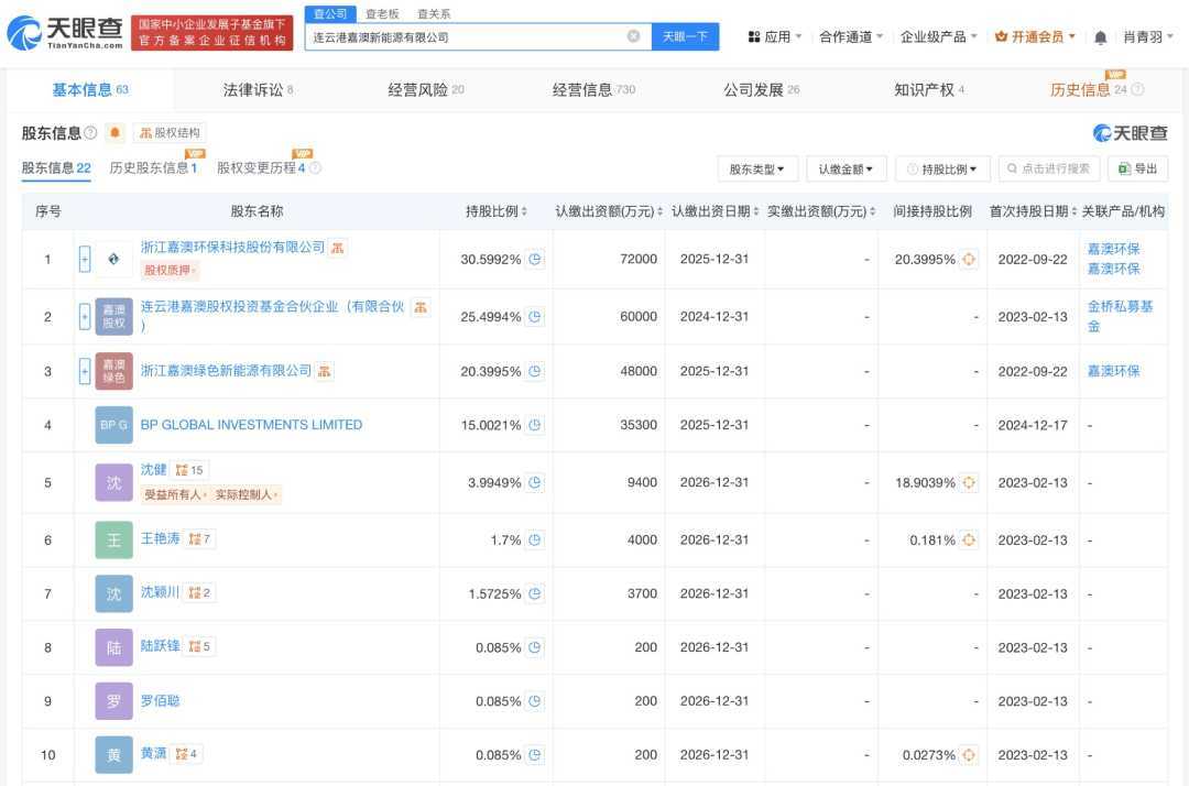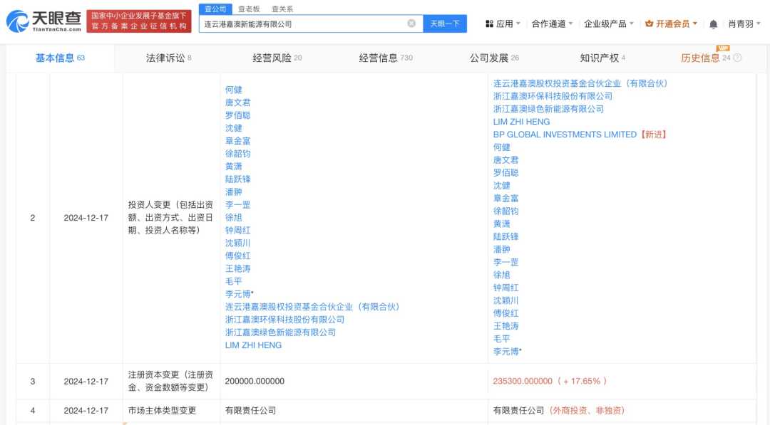 连云港嘉澳新能源有限公司近期发生工商变更,新增BP GLOBAL INVESTMENTS LIMITED为股东,注册资本增至23.53亿元人民币,彰显公司实力增强。