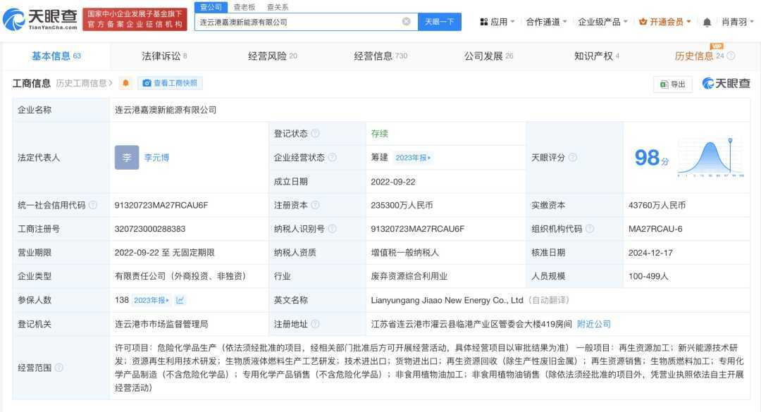 连云港嘉澳新能源有限公司工商变更,注册资本增至23.53亿