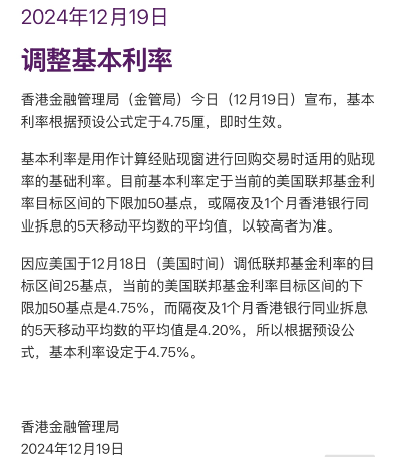 美联储于近日宣布降息25个基点,紧随其后,香港金融管理局也于北京时间12月19日上午8时30分左右宣布,即时将基准利率下调25个基点至4.75%,此举旨在保持与美联储货币政策的同步性。
