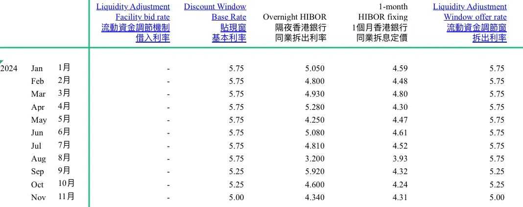 以下为2024年以来香港金融管理局发布的每月基本利率情况概览: