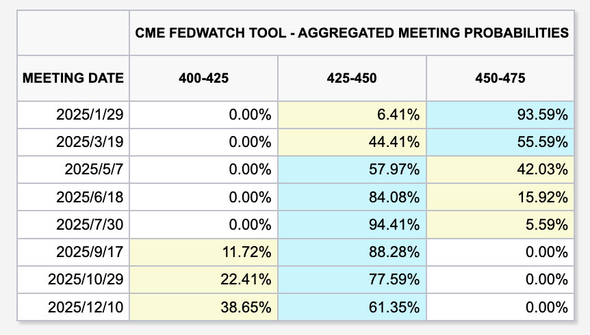 决议公布后,除美元外,美股、美债、黄金以及比特币均遭遇暴跌。美股市场的“恐慌指数”VIX一夜之间暴涨74%,达到四个月来的最高点28.32。市场对降息的预期大幅下降,根据芝商所(CME)的美联储观察工具显示,市场对2025年降息幅度的预期已从原先的两次降息可能性约90%,降至现在的不足40%,而降息一次的可能性则上调至61%,时间点可能在5至7月之间。