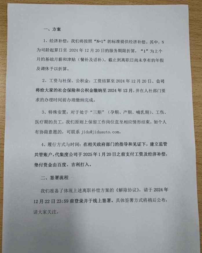 同日,一份极越员工善后方案文件照片在网络上曝光,内容涵盖经济补偿、工资与社保公积金、特殊安置及履行方式与时间等方面。其中,经济补偿与罗岗公布的内容一致;工资结算至2024年12月20日,社保和公积金也将缴纳至该日期;对于特殊群体员工,原则上保留工作岗位直至相应情形结束;在政府部门指导下建立监管共管账户,百度、吉利将垫付资金,于2025年1月20日前支付工资及经济补偿。