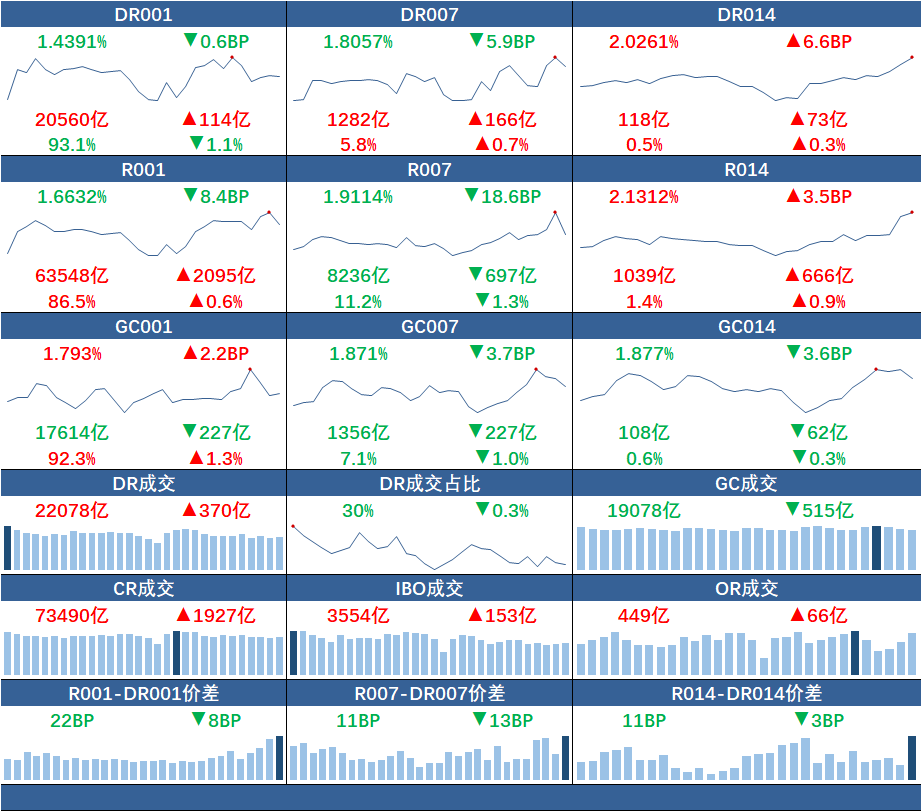 银行间质押式回购市场方面,隔夜和7天品种利率下跌,而14天品种则全线站上2%的关口。具体来看,DR001加权平均利率下行0.6BP至1.4391%,R001加权平均利率下行8.4BP至1.6632%;DR007加权平均利率下行5.9BP至1.8057%,R007加权平均利率下行18.6BP至1.9114%。