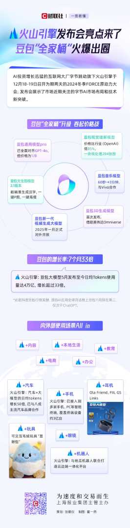 字节跳动旗下火山引擎召开2024冬季FORCE原动力大会,展示AI市场布局和技术新突破,豆包大模型火爆出圈,吸引多家A股上市公司关注。