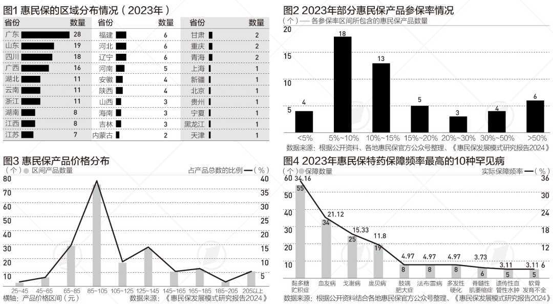 特定药品费用保障责任是惠民保的特色之一。2023年,共有161款惠民保产品通过设置特定药品目录的形式实现特药保障。同时,越来越多的惠民保产品将海外特效药纳入赔付责任,如“北京普惠健康保”“山西晋惠保”等。然而,惠民保仍面临参保率不足、续保率不高等挑战。为应对这些挑战,政府应出台更多支持政策,如允许使用基本医保个人账户余额投保、鼓励企事业单位为员工集体参保等。