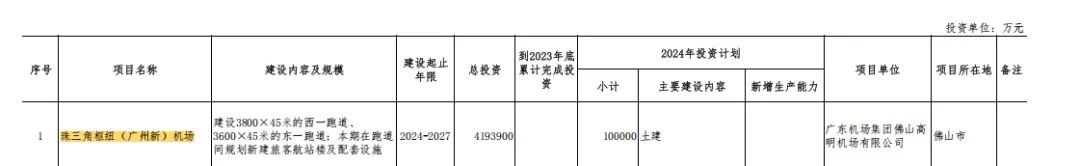 今年初,《广东省2024年重点建设项目计划》已明确将“珠三角枢纽(广州新)机场”项目列入年度开工计划,项目由广东机场集团佛山高明机场有限公司负责,场址选定于佛山市高明区更合镇和肇庆高要区蛟塘镇交界处。机场总投资额高达419.39亿元,其中2024年计划投资10亿元。