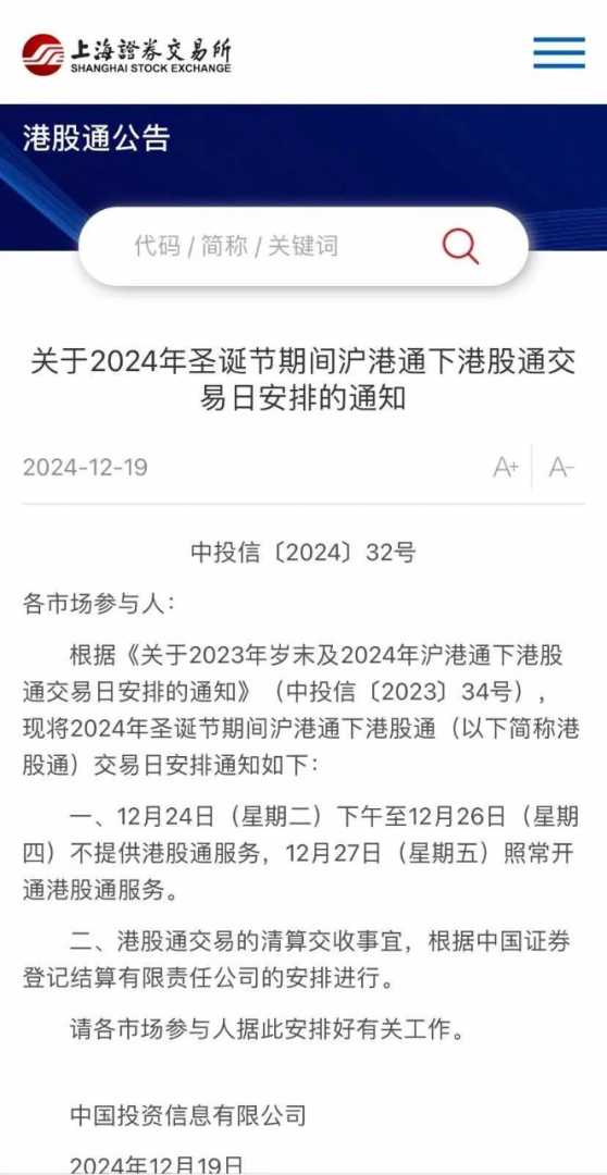 12月19日晚间,沪深交易所官方网站正式发布了其子公司关于2024年圣诞节期间沪深港通下的港股通交易日安排的通知。该通知详细说明了节日期间港股通的交易时间调整情况。