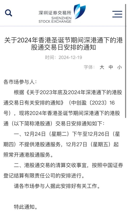沪深交易所发布通知,明确了2024年圣诞节期间港股通的交易时间调整情况,包括暂停服务日期及恢复交易日期,同时提到后续交易日安排需等待证监会通知。