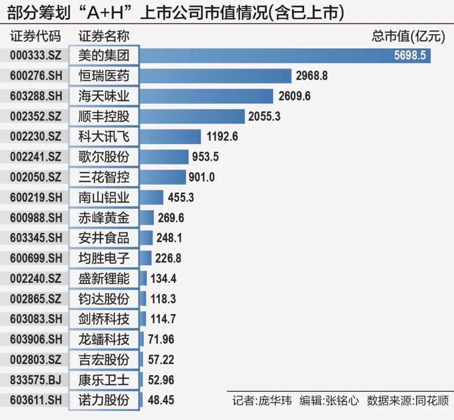 值得一提的是,在今年筹划赴港上市的A股上市公司中,有多家市值超1000亿元的龙头公司,包括美的集团、恒瑞医药、海天味业、顺丰控股等。同时,还有三花智控、科大讯飞、歌尔股份等10多家A股上市公司,在筹划发行H股股票。