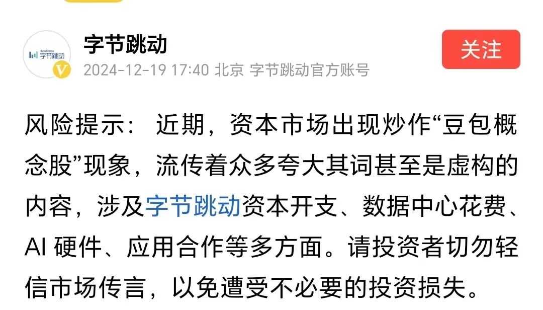 然而,字节跳动官方账号于12月19日下午发布风险提示,指出近期资本市场炒作“豆包概念股”现象严重,市场上流传着诸多夸大甚至虚构的信息,涉及字节跳动资本开支、数据中心花费、AI硬件及应用合作等多个方面。字节跳动方面提醒投资者,应谨慎对待市场传言,避免盲目跟风投资,以免遭受不必要的投资损失。