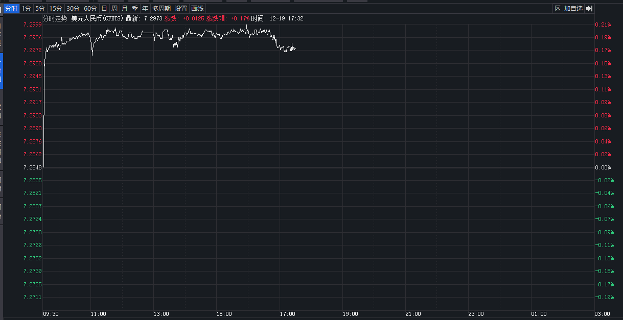 截至12月19日17时,在岸人民币兑美元汇率日内牢牢守住“7.30”关口。