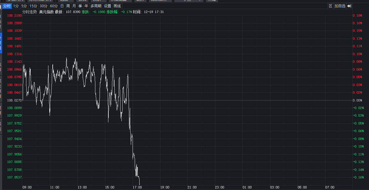 截至12月19日17时,美元指数“跳水”至107.94附近。