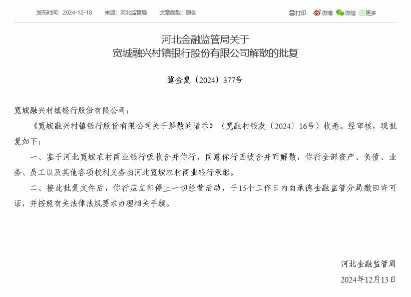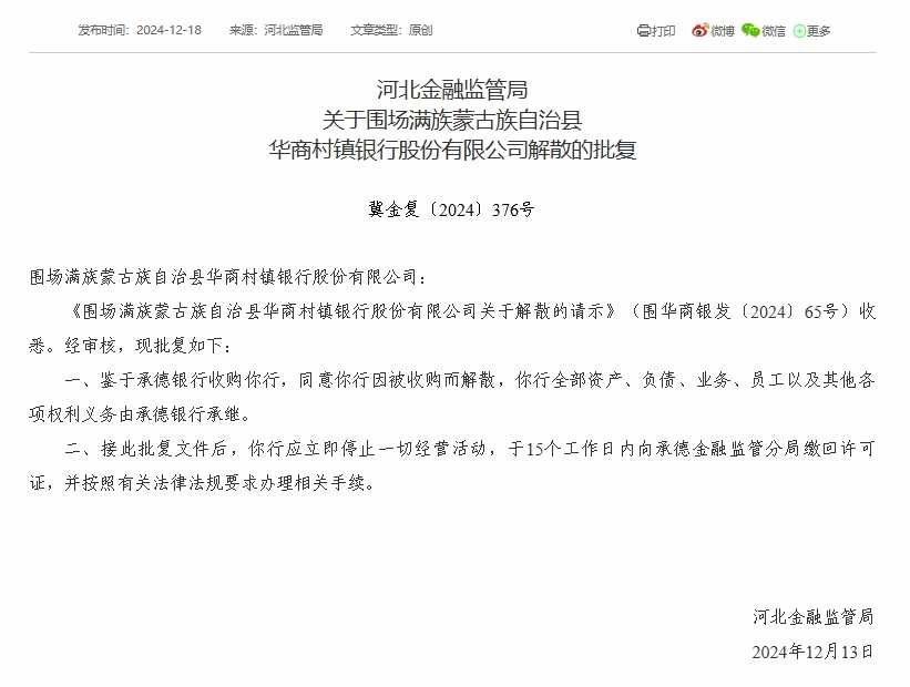 河北金融监管局发布批复,围场满族蒙古族自治县华商村镇银行等三家村镇银行获批解散,分别由承德银行、河北宽城农村商业银行和邯郸银行收购或合并,标志河北村镇银行整合进入新阶段。