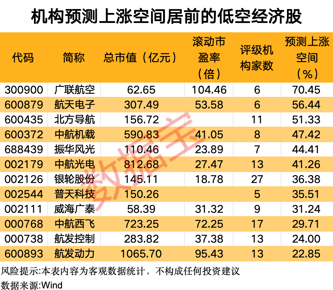 从市场表现来看,Wind低空经济概念指数年内累计上涨显著。以最新收盘价距离机构一致预测目标价来看,广联航空、航天电子、北方导航等企业上涨空间居前。这些企业在低空经济领域拥有较为明显的竞争优势和发展潜力,值得投资者重点关注。