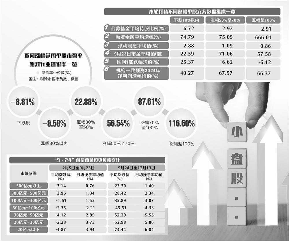 行情的转变总是超乎投资者预料。在9月24日至12月13日期间,A股市场经历大逆转,逾500家公司股价翻倍,70余家涨幅超2倍,其中小市值、低价股表现尤为抢眼。然而,近期高位股退潮,大盘股、消费股蠢蠢欲动。2024年即将结束,中小盘股强势能否延续?大盘股能否逆袭?