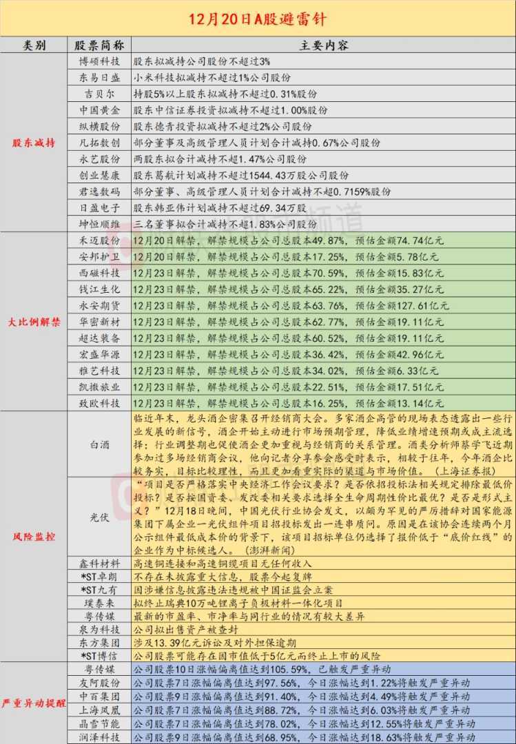导读:财联社12月20日发布投资避雷针报告,梳理了A股及海外市场的潜在风险事件。国内经济信息方面,字节跳动发布风险提示,警示投资者勿轻信“豆包概念股”传言;光伏行业协会严厉质疑央企光伏项目低价中标。公司预警方面,多家公司股东计划减持股份,部分公司存在违法违规风险。海外市场方面,美股三大指数收盘涨跌互现,印尼上调毛棕榈油出口税。