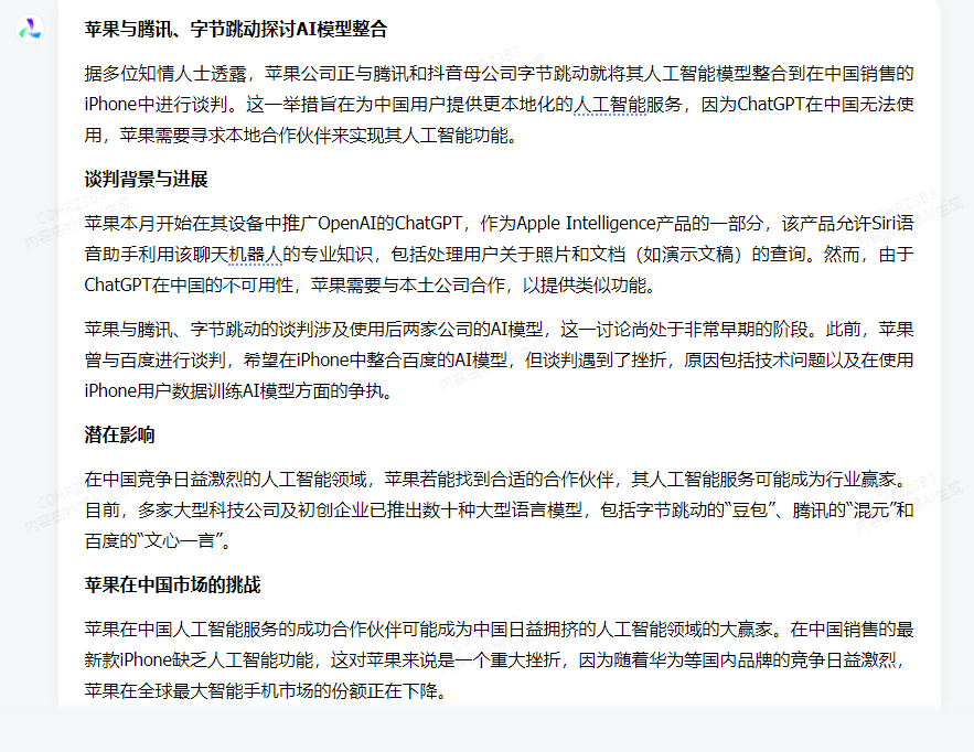 据19日媒体报道,苹果公司正与腾讯和抖音母公司字节跳动进行谈判,旨在将其人工智能模型整合到在中国销售的iPhone中。这一举措的背景是苹果本月开始在其设备中推广OpenAI的ChatGPT,作为Apple Intelligence产品的一部分,但由于ChatGPT在中国市场不可使用,苹果亟需与本土企业合作,以提供类似功能。