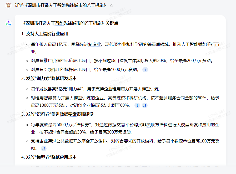 此外,深圳市工业和信息化局近日印发了《深圳市打造人工智能先锋城市的若干措施》,提出每年发放最高5亿元“训力券”、5000万元“语料券”、1亿元“模型券”,支持企业租用算力开展大模型训练、购买非关联方语料进行大模型研发和应用,以及依托生成式人工智能模型开展模型服务、智能体开发应用等。