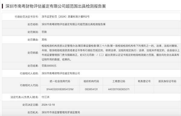 根据深圳市市场监督管理局最新公示,深圳市南粤财物评估鉴定有限公司(简称南粤评估)于12月18日因超范围出具检测报告而受到行政处罚,罚款30000元。该处罚源于南粤评估擅自出具超出其资质认定证书规定的检验检测能力范围的报告。