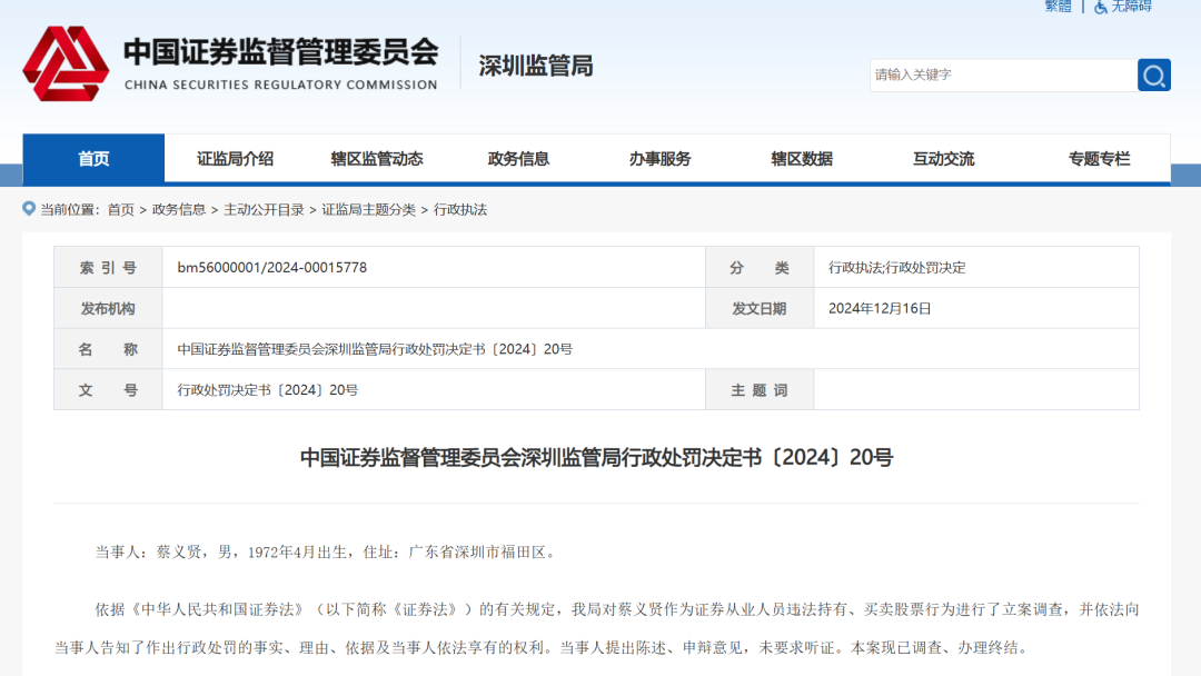 深圳证监局公布券商从业人员蔡义贤违规炒股行政处罚决定,累计亏损超300万元被罚60万元。监管层对券商违规炒股行为保持高压态势,多次重申从业人员切勿触碰违规炒股“红线”。