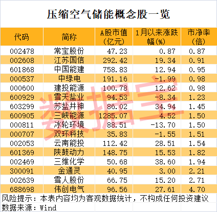 在A股市场,布局压缩空气储能业务的上市公司相对较少,合计不到20家。其中,中绿电、云南能投、陕鼓动力、中国能建等企业均在积极推进相关项目。这些公司的估值水平相对较低,11股滚动市盈率低于20倍,占比超过六成;13股市净率低于2倍,占比超过八成。从机构关注度来看,冰轮环境、伟创电气、云南能投、建投能源四家公司今年以来月均至少获机构调研1次。