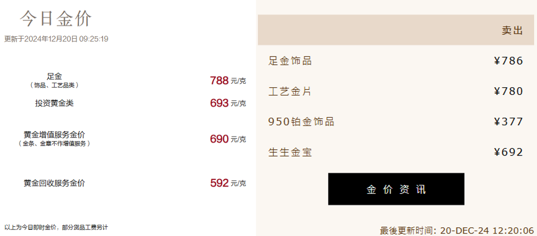 例如,周大福的黄金价格跌至每克788元,较18日的每克802元有所下降;周生生20日的黄金价格为每克786元,也较18日的每克800元有所回落。其他品牌如老庙黄金、六福珠宝、潮宏基等也均出现不同程度的下跌。