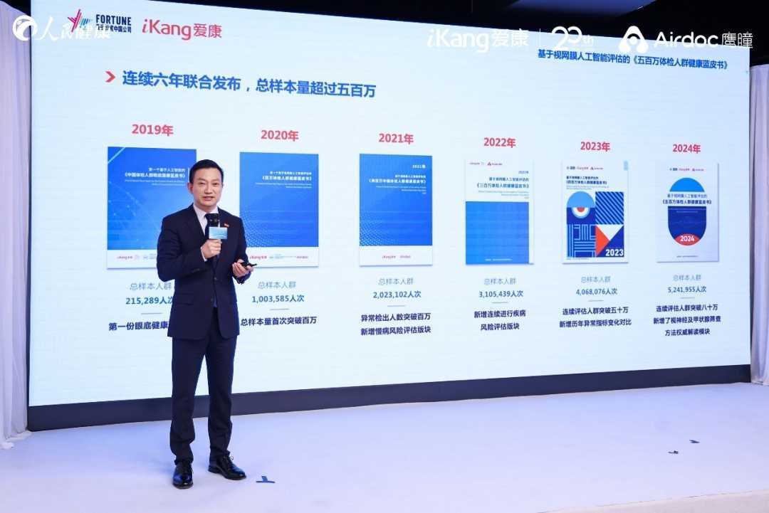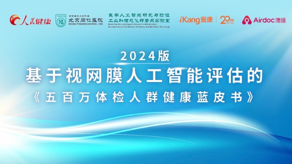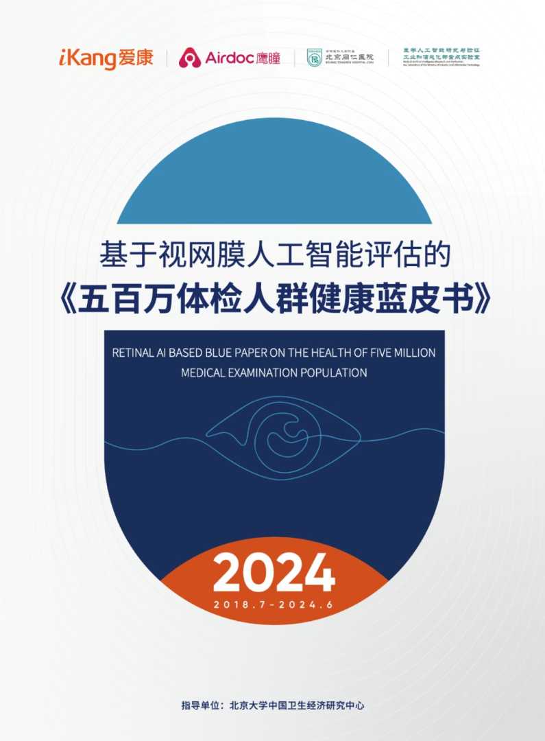 2024年12月20日,在北京大学中国卫生经济研究中心的指导下,由首都医科大学附属北京同仁医院、医学人工智能研究与验证工业和信息化部重点实验室、爱康集团与鹰瞳科技共同发起,人民健康支持的《五百万体检人群健康蓝皮书》(以下简称“《蓝皮书》”)正式发布。这是自2019年起,爱康集团与鹰瞳科技连续六年发布基于视网膜人工智能评估的《体检人群健康蓝皮书》。